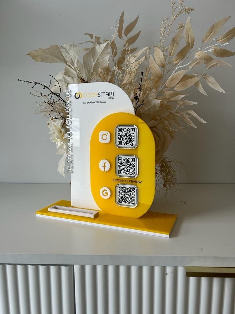 In a world where digital convenience meets design sophistication, the Modern 3 QR Sign Style – 3 Reviews + Card Holder offers an innovative way to connect with your audience. This custom acrylic display sign combines three scannable QR codes with elegant typography, review highlights, and a practical cardholder—making it the perfect business companion for modern entrepreneurs, boutique owners, stylists, and creatives.